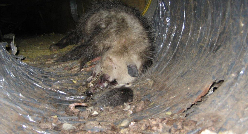 Dead animal carcass removal is specialty work. Sometimes the job is simple, such as a dead opossum in the yard, in which case we can simply wear our gloves and respirator mask, bag the carcass, and take it away for incineration. Sometimes this is more complex, such as when the dead animal is under a home crawlspace, under a porch or deck or shed. Or if the animal is larger, such as a dog or a deer. The most complex cases are dead animals inside the house. The animal may have died inside the attic, or down in the walls, or the duct work, or any other part of the architecture. You may have a bad smell in your home, and you're not even sure what's causing it. We've removed not just dead animals, but rotting food, bad mold, etc. We specialize in locating the source of the smell, and we very commonly cut a hole in the ceiling or wall to remove the animal. We remove every bit of the carcass, mop up the juices, vacuum the maggots, spray it and wipe it down with disinfectant, cleaner, and we repair the hole we cut. In some cases we use ozone machines to neutralize odor.